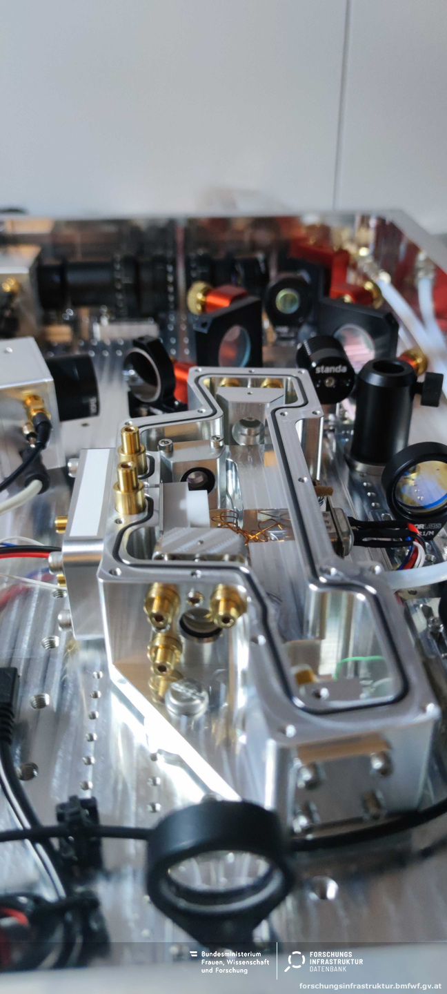 Diese CW Frequenzverdopplungseinheit wird mit einem Ti:Sa laser bei 820nm und mehreren Watt an Leistung betrieben, um schmalbandiges Licht bei 410nm zu erzeugen.