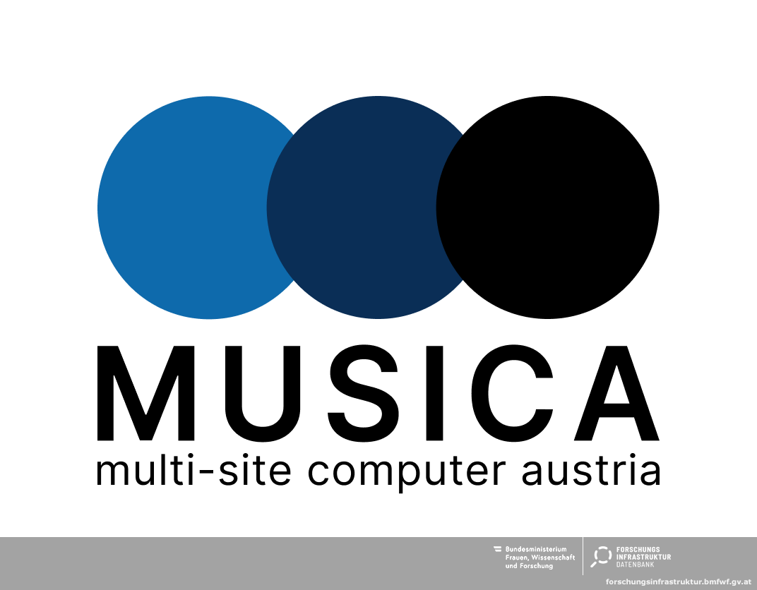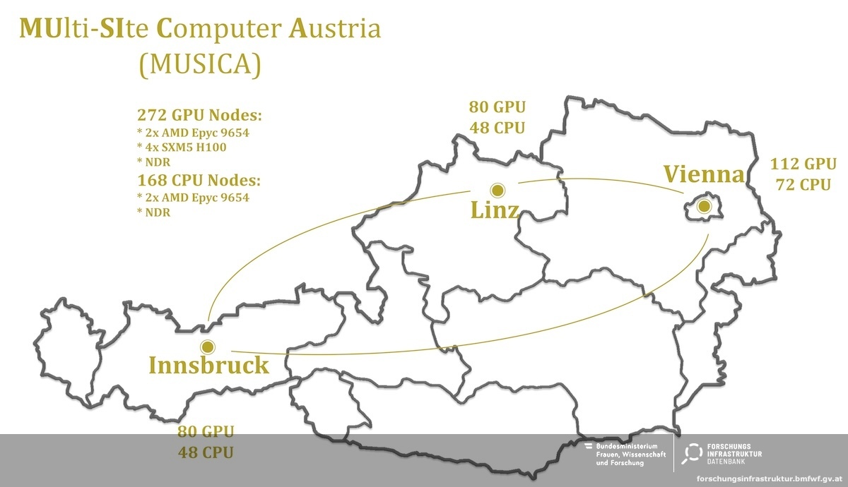 MUSICA ist ein verteilter Hochleistungsrechner an den Standorten Wien, Linz und Innsbruck. An jedem Standort befindet sich ein Rechner-Cluster. Jedes der drei Cluster besteht aus 128 (Wien: 184) einzelnen Rechnern (Knoten). Die einzelnen Rechner verfügen jeweils über 2 AMD-CPUs mit je 96 Kernen und 768 GByte Hauptspeicher. Je 80 (Wien:112) Knoten sind zusätzlich je Knoten mit 4 NVIDIA Hopper H100 GPUs ausgestattet. Insgesamt stehen 84.480 CPU-Kerne und 1088 H100 GPUs zur Verfügung. Die Knoten an einem Standort sind untereinander sowie mit den Filesystemen mit einem Hochleistungsnetz von 400 GBit/sec verbunden. Neben normaler Anbindung an ein Filesystem verfügt jeder Standort über ein Hochleistungsfilesystem mit einer Kapazität von jeweils 4 PByte und einem Durchsatz von etwa 1 TByte/sec. Die Standorte sind untereinander mit einem privaten Netzwerk von 100 Gbit/sec verbunden.