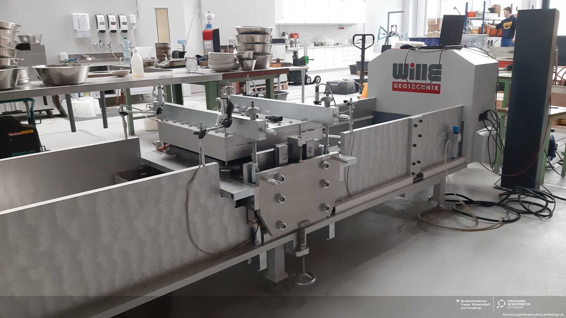 Bei der Forschungsinfrastruktur handelt es sich um ein Großrahmenschergerät mit einer Einbaufläche von 500 x 500 mm und einer Einbauhöhe von max. 200 mm zur Durchführung von Scherversuchen und Kompressionsversuchen an grobkörnigen Böden.