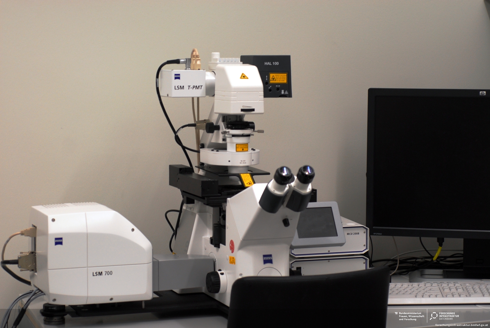The available systems support high resolution imaging of tissue sections or cells, 3D and 4D acquisition, visualization of protein-protein interactions (like FRET) and live cell imaging. Furthermore the facility offers workstations to the users, which allow an onsite evaluation and processing of their data with the suitable software.