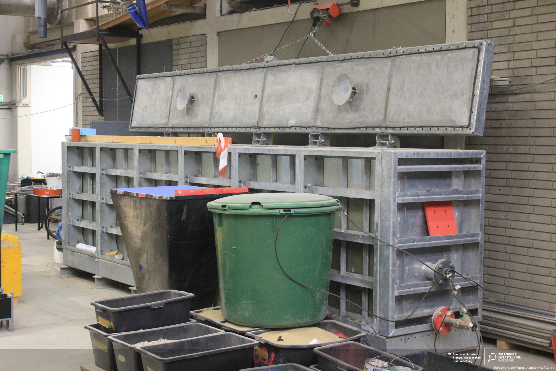 Druckmesszelle (B/L/H = 6m*1.6m*1m) bestehend aus einer Stahlkonstruktion, die über den Deckel mit Bodenmaterial (z.B. Sand) befüllbar ist. Vom Hochbehälter aus wird die Druckzelle über Einläufe im Deckel und ein Regulierungsventil im unteren Auslass durchströmt, im Boden verlegte Messinstrumente dienen der Bestimmung der Filtergeschwindigkeit entlang von Glasfaserkabeln.
