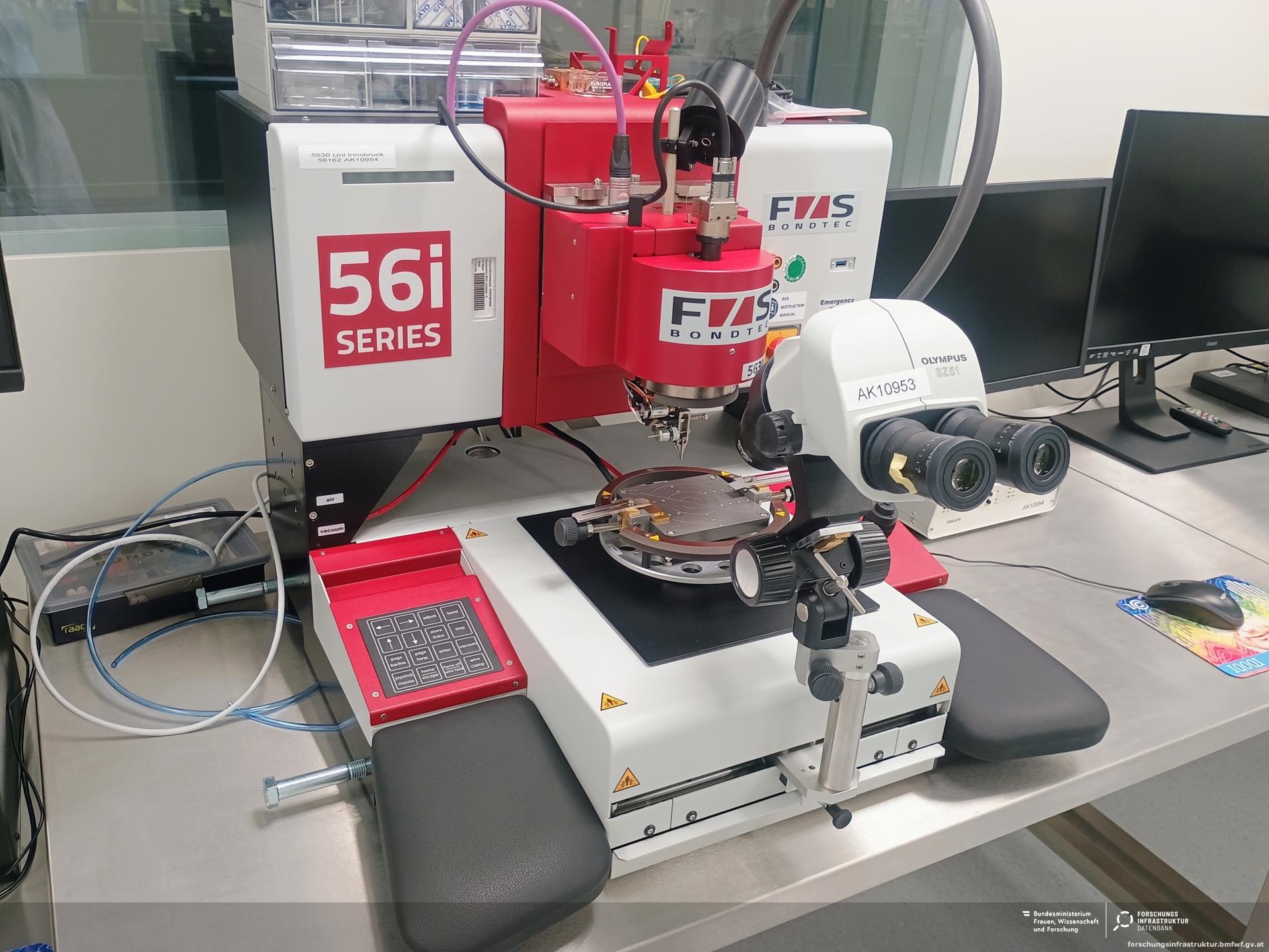 The machine allows for automatic bonding of semiconductor chips with aluminium wire. For instance bonds between gold and gold, or aluminum and gold. Our expertiese lies in bonding of ion-traps on chip.