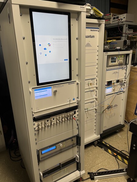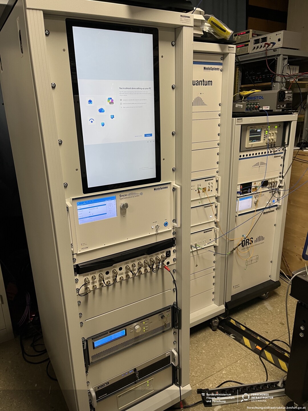 The Menlo Systems frequency comb system is a fully stabilized laser source that generates a phase-coherent optical frequency comb spanning providing wavelengths: 674 nm, 729 nm, 1068 nm, 1069.5 nm, 1156 nm, 1299 nm, 1542 nm, and 1762 nm. It provides a narrow optical linewidth of sub-Hz to few Hz, enabling high-precision frequency metrology, optical clock comparisons, and spectroscopy. The system offers long-term stability and low phase noise.