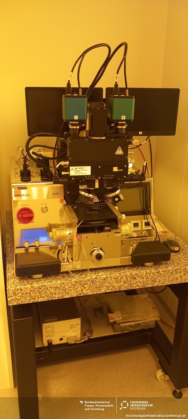 The SUSS MJB4 Mask Aligner provides precise UV photolithography for substrates up to 100 mm in diameter, achieving sub‑micron resolution. In combination with the expertise of the supervising researchers, alignment and exposure processes are optimized to fabricate micro‑ and nanoscale structures. The infrastructure is regularly used for applications in MEMS, optoelectronics, microfluidics, and nanoimprint lithography (UV‑NIL).