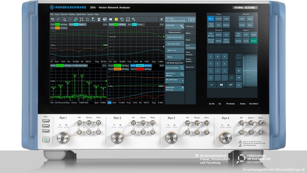 Vector network analyzers, 4 ports, for frequency ranges from 10 MHz to 43.5 GHz. Extension to existing measurement capabilities in the area of integrated circuits characterization for high-frequency components up to 43.5 GHz