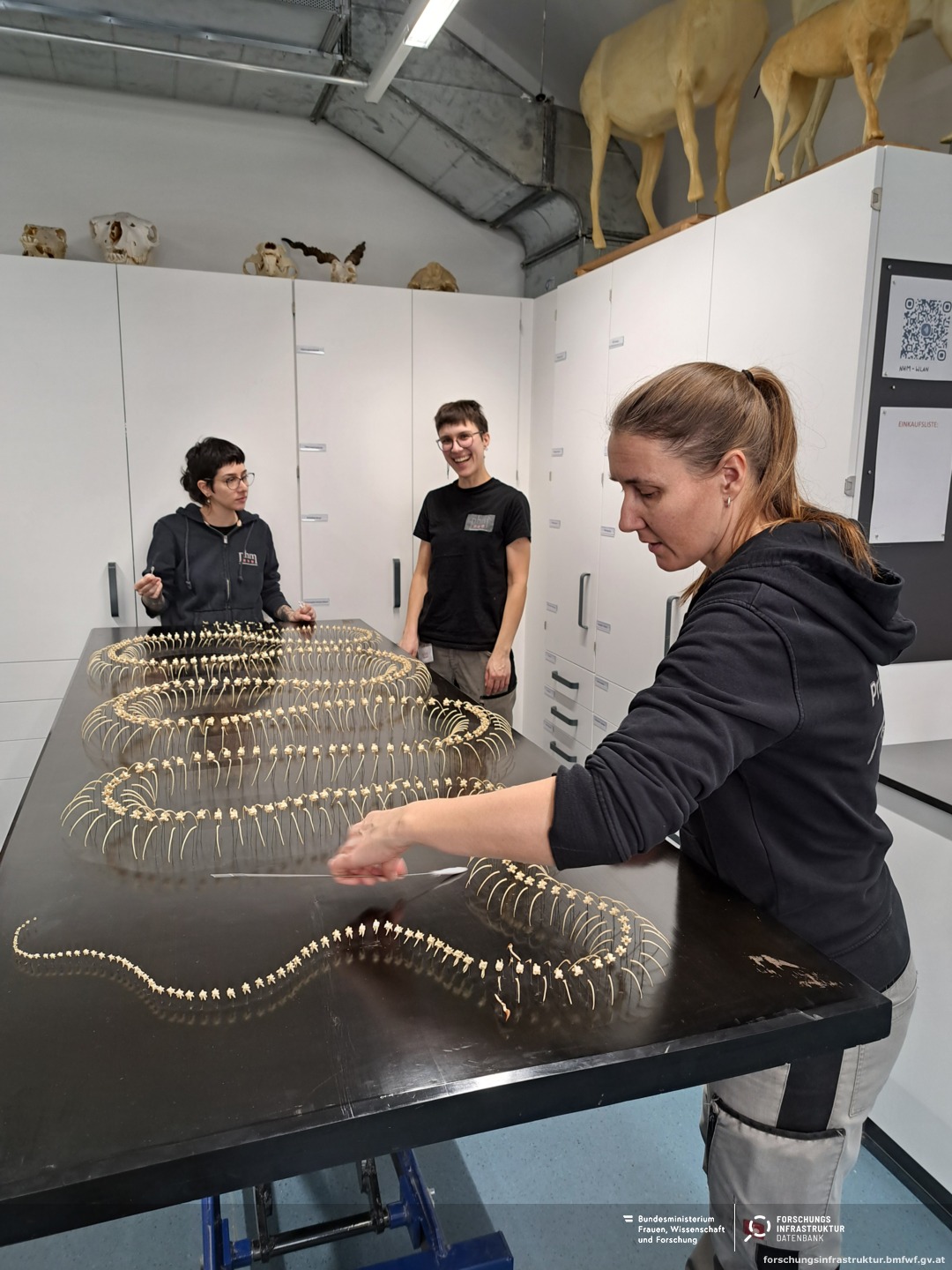 The team works primarily with vertebrates, providing total taxidermy mounts, skeletons, skins, DNA samples, models, and other materials to preserve specimens and support research of the Museums scientific collections, where the greatest variety of specimens is housed. This includes hides, fluid preparations, and bones in boxes, some centuries old, others newly prepared, ensuring a constant supply of current objects for basic research. Furthermore, the preparators are responsible for creating new exhibits and maintaining the exhibition spaces to continually captivate visitors. This also involves preserving and promoting biodiversity.