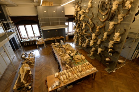 The collection consists of skeletons, study skins, furs and stuffed specimens, as well as specimens preserved in alcohol. From skeletons of earlier times, often only skulls were preserved, because these contain the most important identifying features in mammals. Currently, we are trying to close the gap regarding postcranial material. Study skins are uniformly prepared specimens for scientific purposes. Stuffed specimens are artfully finished for exhibition purposes. They show the animal in the most natural position possible. With ca. 9,000 specimens, the collection of mammals preserved in alcohol is relatively small; however, it is now in the process of being expanded since DNA for genetic studies is much easier to extract from specimens preserved in alcohol than from other materials. Alcohol specimens can also be studied with respect to internal anatomy by means of modern imaging technology, e.g. µCT-scanning.
