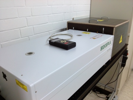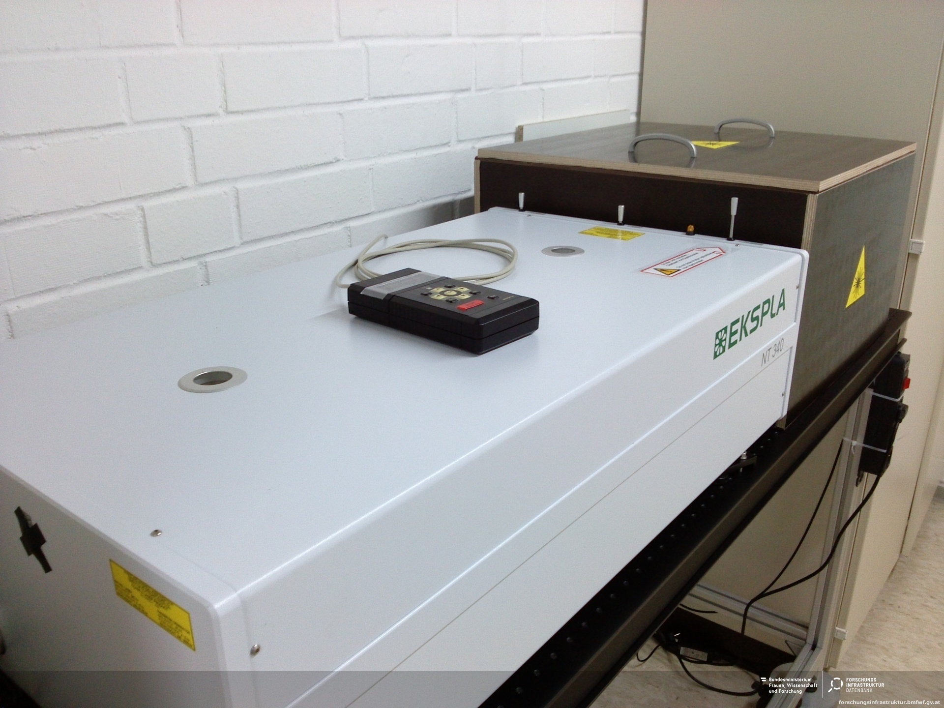 Das Lasersystem liefert computergesteuert gepulstes Laserlicht im Wellenlängenbereich von 192 nm bis 2600 nm mit einer Pulslänge von ca. 4 ns und Pulsenergien von 0.3 mJ bis 30 mJ, je nach Wellenlänge.