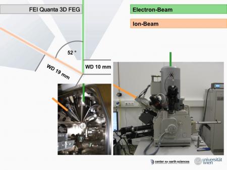 Das Zweistrahlgerät kombiniert ein Feldemissions-Kathoden SEM für hochauflösende Rasterelektronenmikroskopie mit einem FIB-Gerät für Ionenstrahl-Materialbearbeitung zur Erstellung von Querschnitten, Serienschnitten und elektronentransparenten Lamellen. Neben der semiquantitativen mineralchemischen Analytik mittels EDX, ermöglicht die EBSD-Kamera die Abbildung von kristallographischen Orientierungen an hochpolierten Oberflächen.