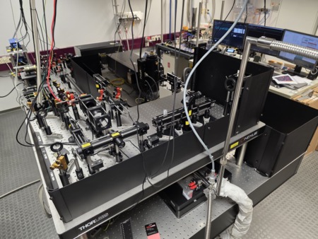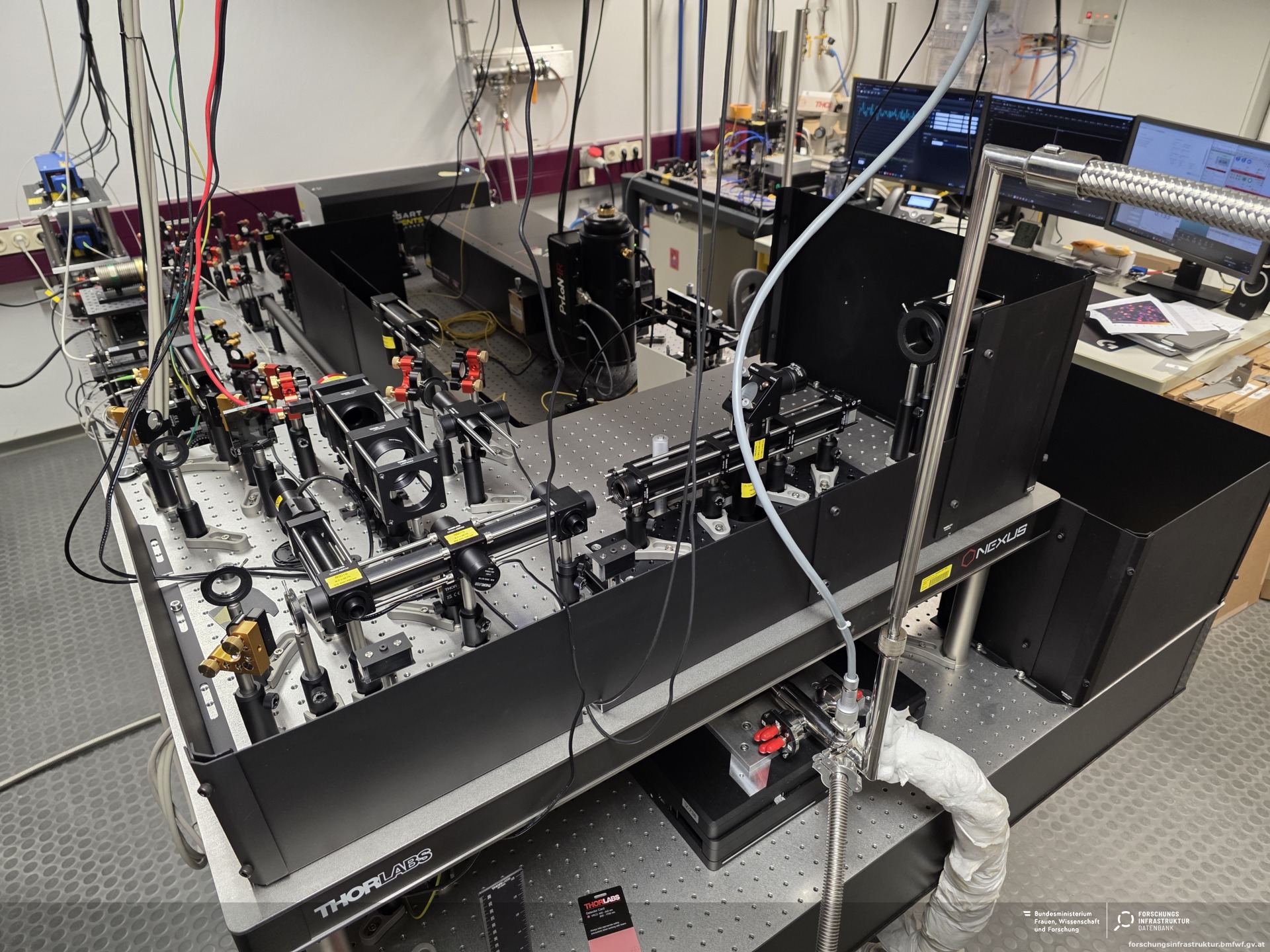 The Optical Infrared Setup (OIS) enables the spectroscopic investigation of the optical response (luminescence) of semiconductor materials and corresponding micro- or nanostructures. At its core, the OIS consists of two separate excitation paths for different wavelength ranges, a cryostat and positioning system for the sample under investigation, and the detection path. For photoluminescence excitation, several fixed-wavelength lasers in the visible range (currently 440, 473, and 650 nm) are available, as well as a tunable picosecond laser system for the telecommunications wavelength range from 1260 nm to 1675 nm. The respective laser light is focused onto the sample using an objective lens. The cryostat and positioning system enables studies at variable sample temperatures ranging from 4.2 Kelvin to 500 Kelvin and provides a positioning accuracy of < 250 nm. The luminescence signal is collected via the same objective lens and directed into the detection path. The wavelength range detectable in the OIS generally extends from 800 nm to 1700 nm, although the setup is optimized for the telecommunications wavelength range. The light emitted by the sample is spectrally split by a grating spectrometer and directed to a liquid nitrogen-cooled InGaAs line detector, which records the spectra. For time-resolved and time-correlated measurements, the detection path also provides a fiber-optic link to a single-photon detection system.