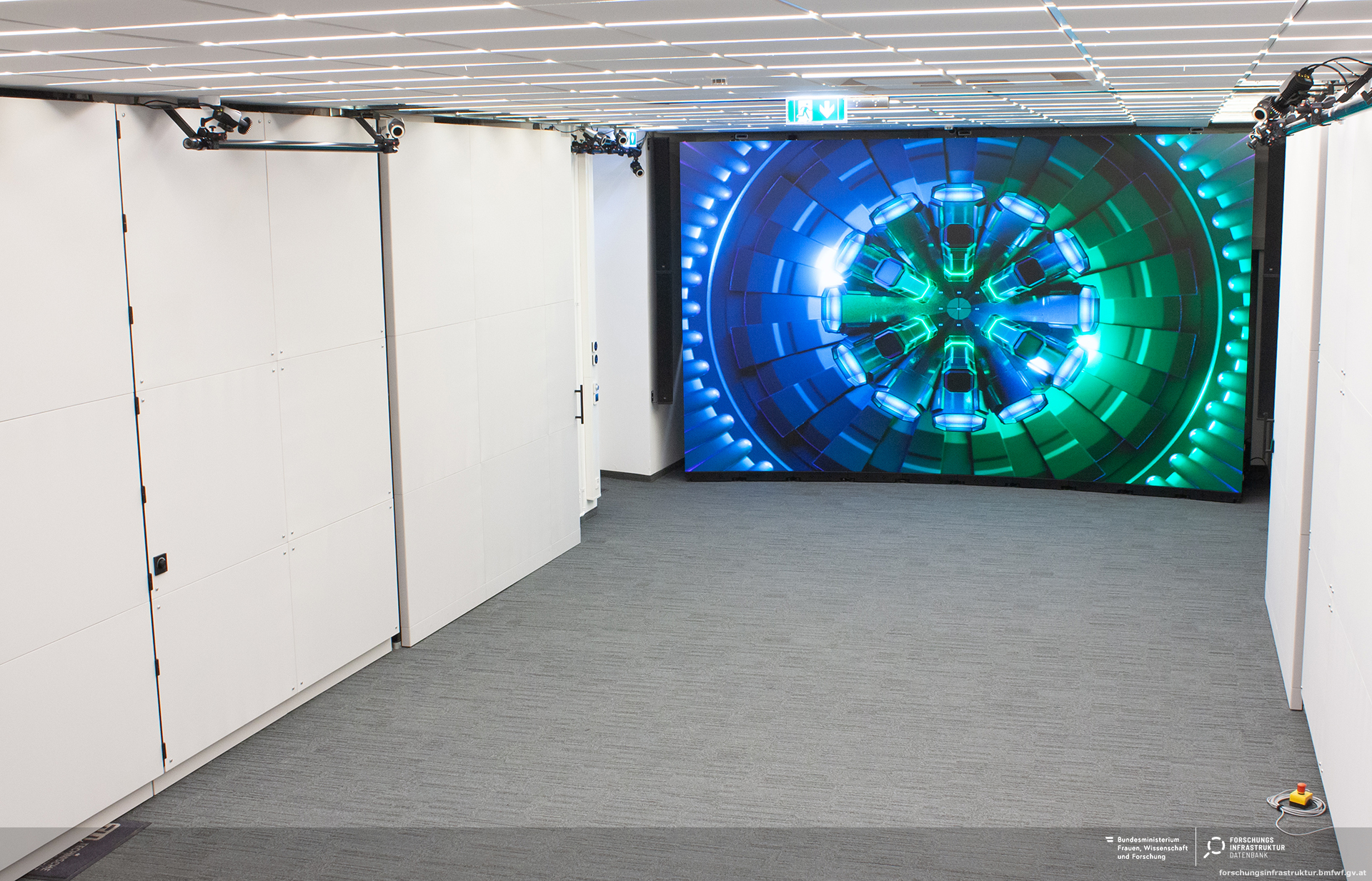 The main functionality of MRLab is to provide a large walkable virtual environment with high-quality visual, auditory, and haptic stimuli. For this purpose, the MRLab will contain a 3D CAVE system that surrounds a user with four high-resolution LED walls with 3D stereo rendering. Additionally, a high-precision tracking system in MRLab ensures interactivity of VR visualizations.