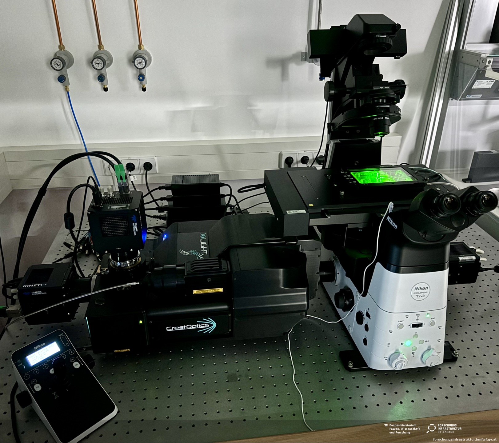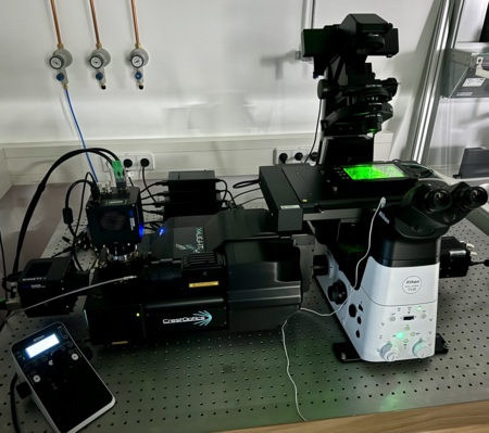 The system supports a wide range of modern microscopic techniques, including bright-field, phase-contrast, dark-field, wide-field fluorescence, and confocal microscopy. Measurements can be performed under strictly controlled environmental conditions, with temperature and humidity precisely regulated via an integrated incubator system to ensure reproducible and physiologically relevant conditions. The data analysis pipeline includes a variety of advanced methods, such as Differential Dynamic Microscopy (DDM) and particle tracking, thereby enabling the quantitative characterization of dynamic processes across a wide range of length and time scales.