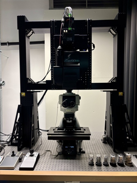 The Upright X-light V3-02 spinning disk microscope is a large Field Of View Spinning Disk microscope. The system is specifically configured to acquire fast and precise 3D stacks of large - to - extra-large samples. A wide variety of low magnification, high NA long working distance dipping objectives, combined with an extra-large range motorized stage provide a system to image fixed, cleared and expanded samples.