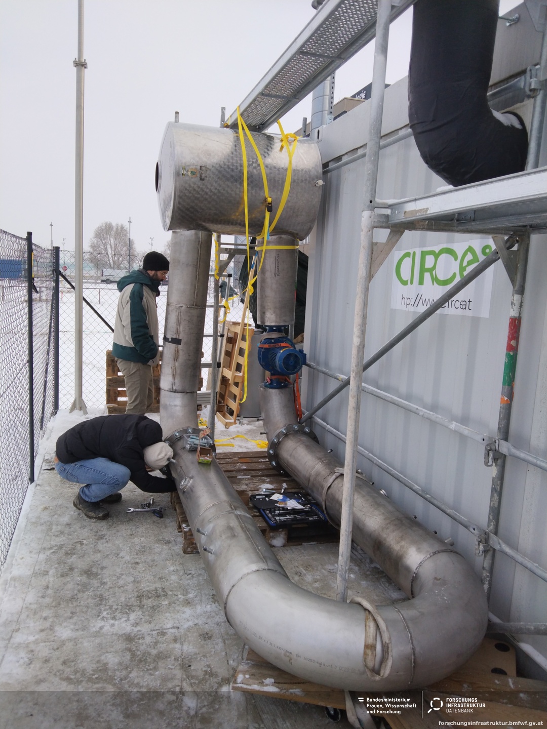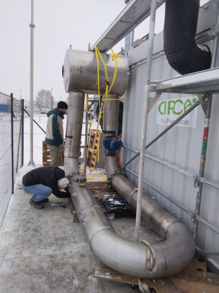 A horizontal loop fermenter with 400L volume. It is configured for CH4/O2 and H2/CO2. Parallel installation to our 150L stirred tank fermenter. The installation allows experiments for mass transfer.