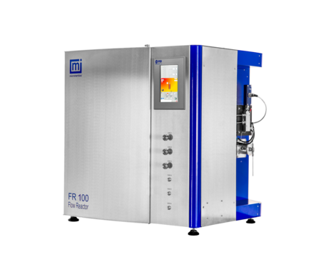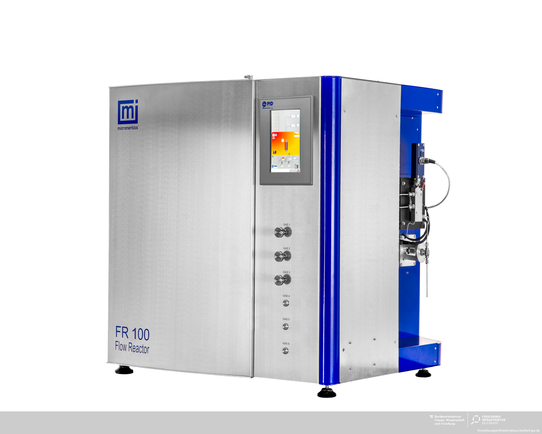 Der Flow-Reaktor (Hersteller Micromeritics) dient der experimentellen Forschung von Gas-Umwandlungsreaktionen mit Hilfe von Katalysatoren und Gas-Speicherprozesse mittels Absoptionsprozessen. Es können am Einlass Gasmischungen mit max. 4 Komponenten mit Flow-Raten bis max. 2,5 ml/min erzeugt werden, die in einem zylindrischen beheizten Reaktor bis max. 500°C, 80 bar reagieren. Der Auslass ist mit einem Analysegerät (Massenspektrometer Calypso, Hersteller IP-Instruments) verbunden. Das Massenspektrometer ermöglicht die Analyse der Zusammensetzung des Gases aus dem Flow-Reaktor und die Veränderung im Vergleich zum Gaseinlass, z.B. durch selektive Umwandlung oder Speicherung einer Gas-Komponente.