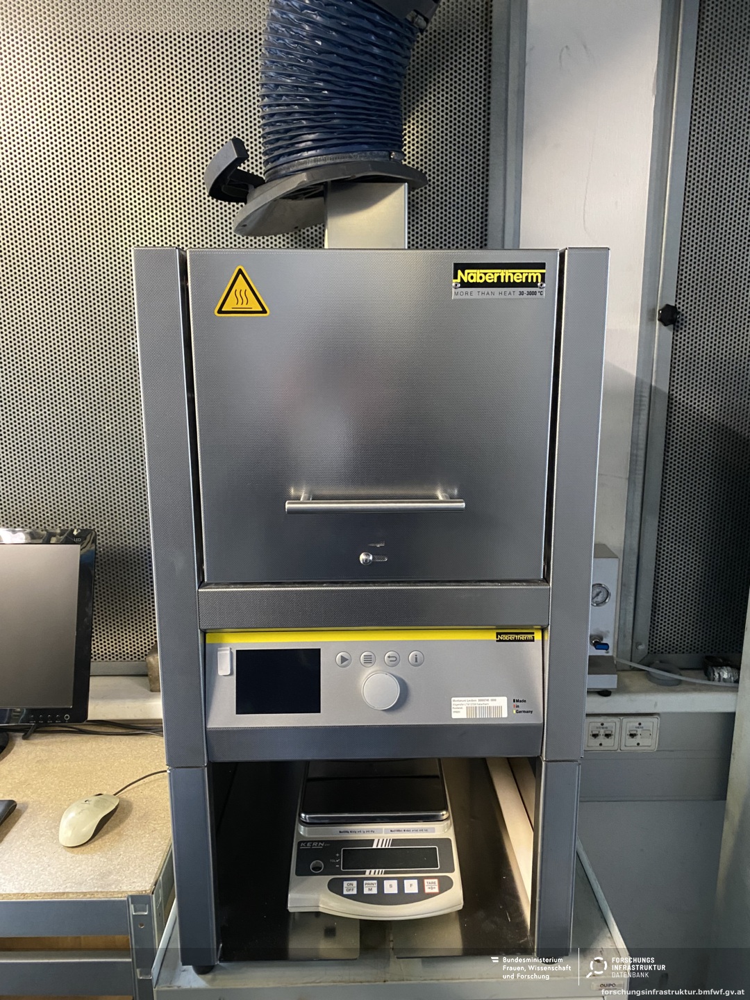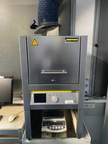 Elektrisch beheizter Muffelofen für eine maximale Temperatur von 1200 °C mit Waage, um den Glühverlust zu bestimmen.