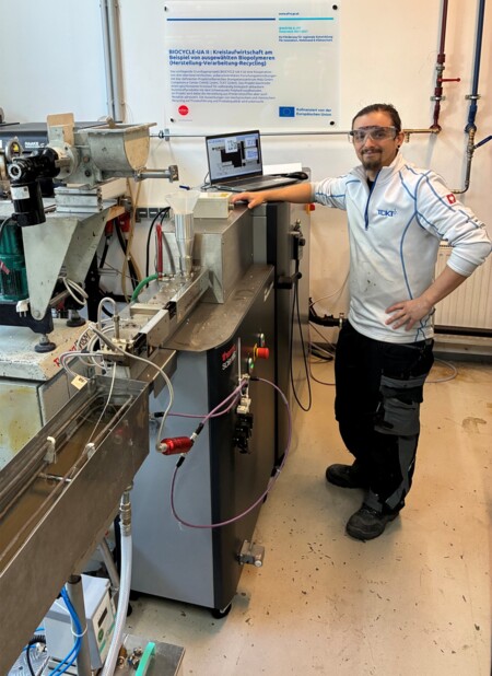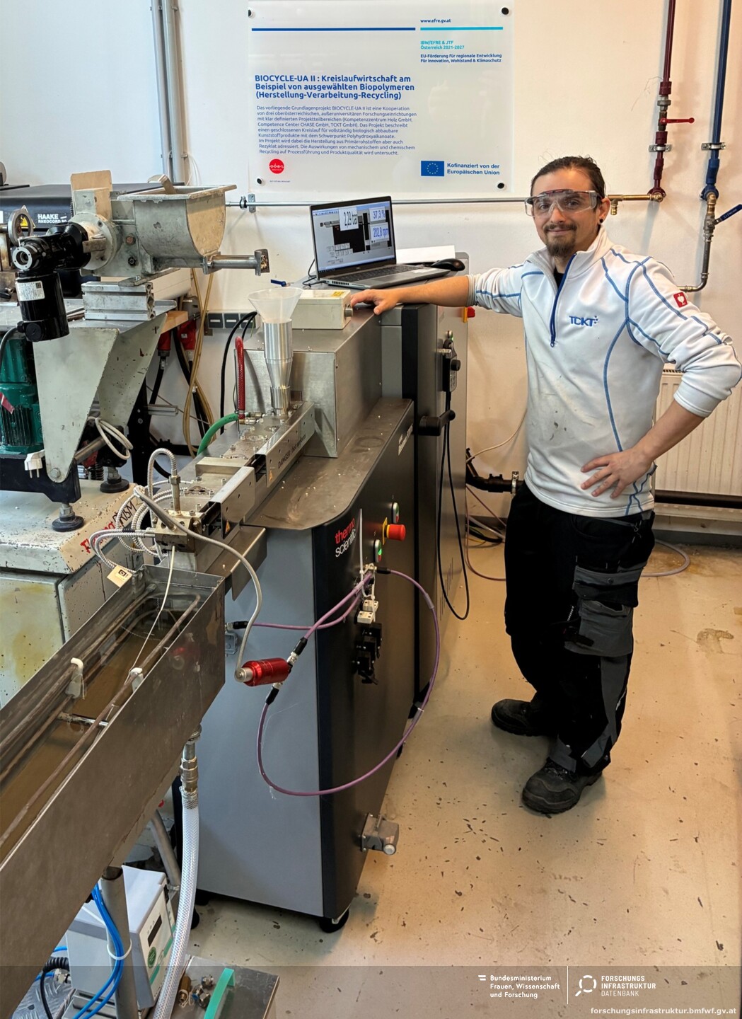 Die Infrastruktur ist ein Haake Polylab Extrusionssystem, welches mit einem 16 mm Doppelschneckenextruder (40 L/D), mit Edelstahl-Barrel und Schnecke ausgerüstet ist. Die Schnecken können modular aus unterschiedlichen Elementen (Förderer, Knetblöcke, Rückförderer, spezielle Mischelemente, Einzugs- und Ausstoßelemente) beliebig angepasst werden. Es können damit (Bio-)Kunststoffe, Additive, Füll- und Verstärkungsstoffe gemischt und zu Strängen extruidert werden (Kühlung im temperierten Wasserbad oder über ein Förderband), die anschließend zu Granulat unterschiedlicher Länge (Vari-Cut Granulierung) geschnitten werden. Ebenso ist es möglich, Flüssigkeiten direkt in den Extruder zu dosieren. Die Entgasung der Schmelze kann sowohl atmosphärisch als auch mit Vakuum erfolgen. Es können Durchsätze zwischen 0,5 und 10 kg/h und Temperaturen bis zu 400 °C eingestellt werden. Für die Dosierung stehen volumetrische Dosieraggregate zur Verfügung. Ergänzt wird das System durch einen Wechselaufsatz, genauer einem Einschneckenextruder, welcher mit einer Flachfoliendüse (ca. 10 cm breite Folien) und einem Folienabzug mit hülsenlosen Wickler ausgestattet ist. Zur weiteren Behandlung der Granulate stehen Trockner zur Verfügung. Ebenso können Prüfkörper mittels Spritzguss oder Pressverfahren hergestellt werden.