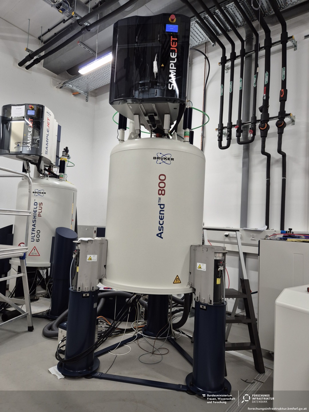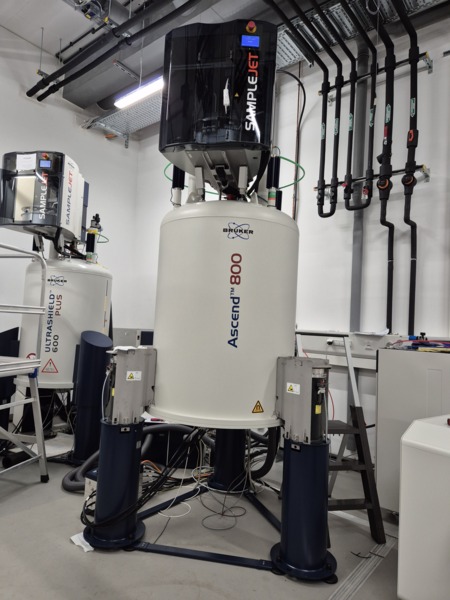 Hochfeld 800 MHz NMR-Spektrometer mit Avance Neo X Konsole für die Metabolomik und Strukturbiologie von Biomolekülen und biomolekularen Komplexen. Das System besteht aus einem 18,8 Tesla Magneten mit 1H/19F/13C/15N TCI (cryo)- und 1H/13C/15N TXI Probenköpfen sowie einem temperaturgeregelten SampleJet-Probenwechsler für bis zu 500 Proben. Unser System ist das weltweit erste 800 MHz IVDr-System (In Vitro Diagnostics Research) für standardisierte und hochdurchsatzfähige NMR-basierte Metabolomik und klinische Stoffwechselanalysen.