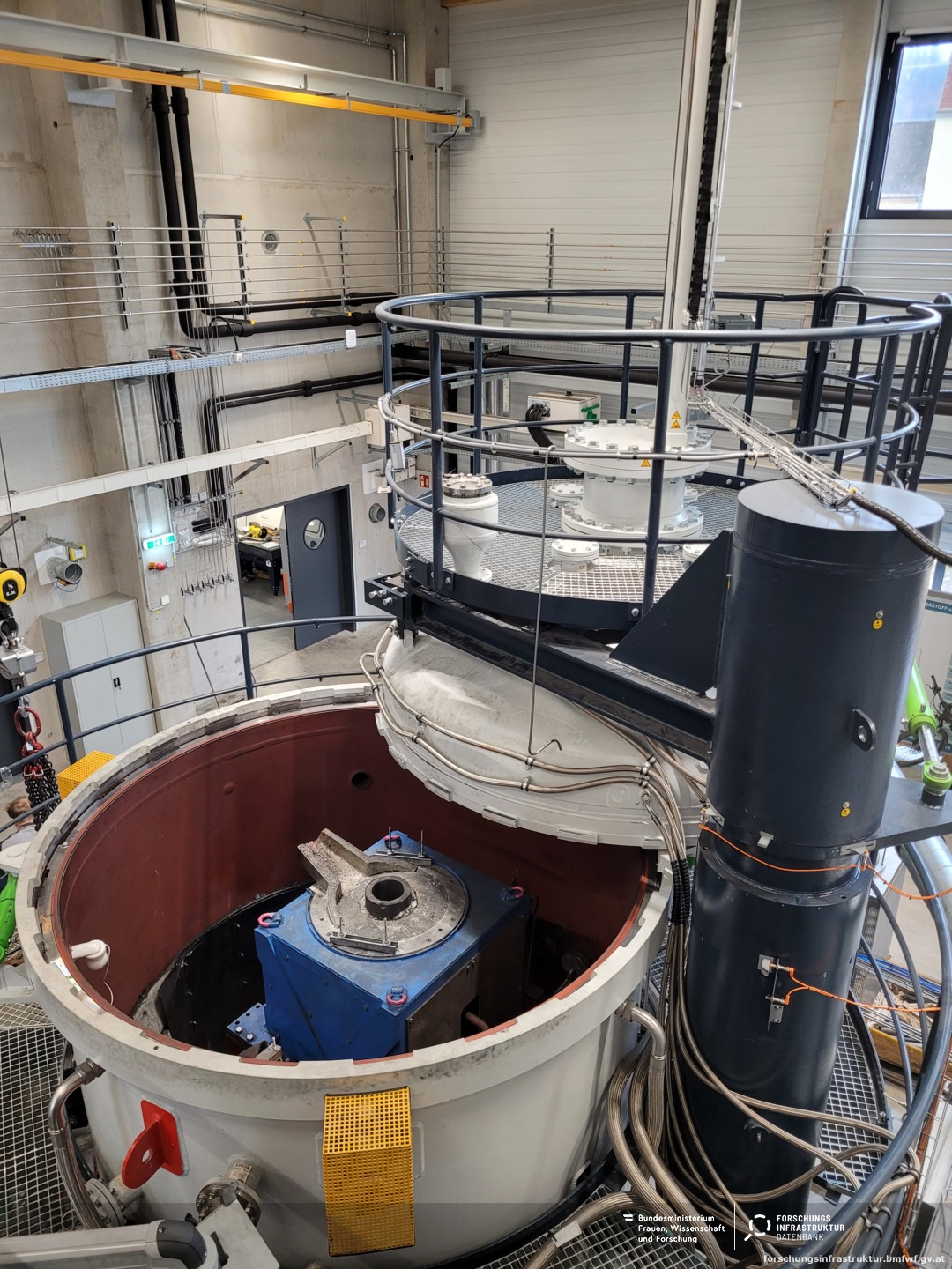 Die induktive Beheizung ermöglicht ein schnelles und präzises Aufheizen der Schmelze sowie die gezielte Einstellung definierter Temperatur-Zeit-Profile. Je nach Auslegung können Prozesstemperaturen bis etwa 1600 °C erreicht werden. Die Anlage ist für unterschiedliche Tiegelgrößen und Metallbadvolumina konstruiert, wodurch eine flexible Anpassung an verschiedene experimentelle Anforderungen möglich ist. Durch die Integration der Induktionsspulen in einen druckdichten Reaktor können neben thermischen auch druckabhängige Effekte auf Reaktions- und Stofftransportprozesse untersucht werden. Die Anlage ermöglicht die gezielte Einbringung von Gasen in die Schmelze sowie die Durchführung von Experimenten in definierten Atmosphären.