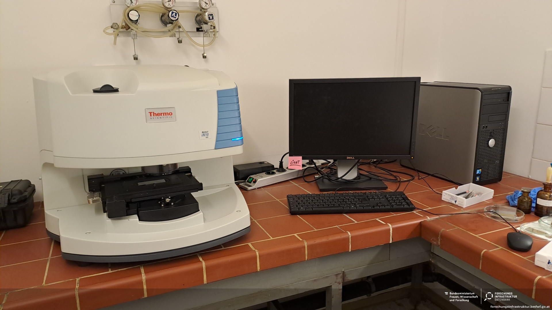 Das beschaffene Gerät – Nicolet in 10 MX IR Microskop - ist ein FTIR-Mikroskop mit entsprechender instrumenteller Ausstattung für FTIR-Mikronalyse. Es ermöglicht die Aufnahme von FTIR-Spektren von festen (Partikel, Pulver, Faser, Querschliffe) oder flüssigen Proben (ev. auch gasförmigen) in Mikrobereich, sowohl als Oberflächenanalyse oder im Transmissionsmodus im Bereich von 4000 – 400 cm-1). Mit eingebautem MCT-Detektor ist es möglich, Partikel oder Probeflächen mit einem Durchmesser kleiner als 20 μm zu analysieren und ist mit einem motorisierten Probentisch kombiniert, was auch FTIR-Mapping durchführen lässt. Bestandteil des Gerätes ist auch eine entsprechende Bedienungs- und Auswertungssoftware (OMNIC Picta-Software), inkl. einer breiten Datenbank von FTIR-Spektren.