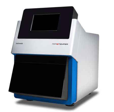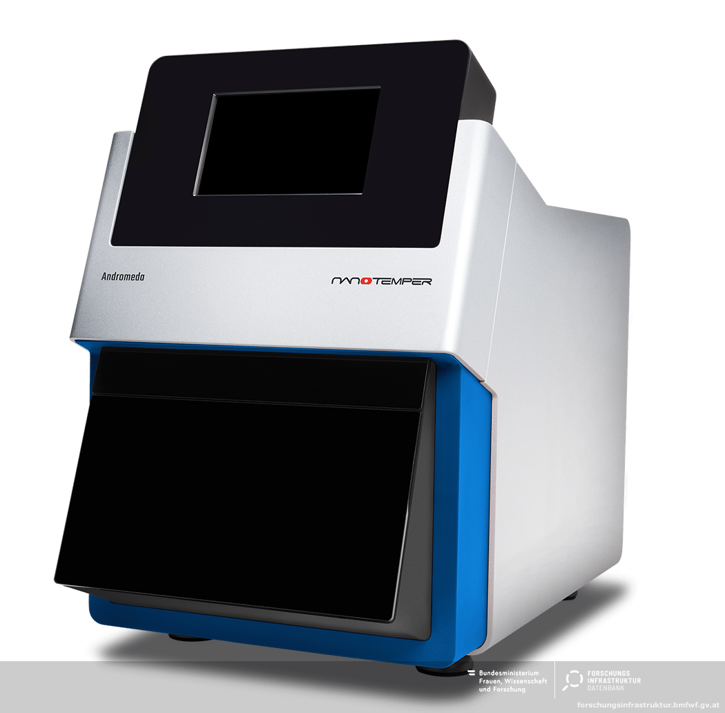 The NanoTemper Andromeda X is a state-of-the-art biophysical instrument designed to measure the stability of RNAs and optimize the expression and quality of recombinant proteins in the early stages of drug discovery. It uses Nano Differential Scanning Fluorimetry (nanoDSF), a technique for monitoring protein stability by measuring changes in intrinsic fluorescence as a function of temperature — it has recently been shown that the same principle can also be used for position-specific stability measurements of RNAs. For proteins, the principle is based on the fact that the environment of the tryptophan and tyrosine residues in a protein changes during thermal denaturation, leading to a shift in the emission spectrum. For RNAs, specific fluorescent markers must be incorporated at specific sites. During heating, the protein unfolds, and the exposure of the hydrophobic regions leads to a change in fluorescence intensity, which is detected in real time. In RNAs, unfolding causes a change in the environment of the incorporated fluorophore. By analyzing the temperature at which these fluorescence changes occur, nanoDSF provides information about the melting temperature (Tm) of the protein/RNA, which reflects its stability.